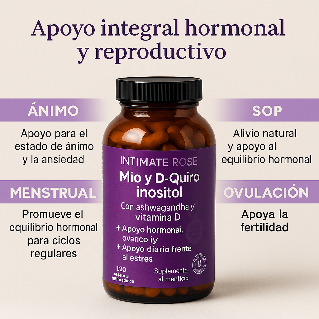 Este suplemento combina Inositol (Myo y D-Chiro), vitaminas B6, D, ácido fólico e isoflavonas en una fórmula diseñada para apoyar el sistema hormonal, mejorar el estado de ánimo y contribuir a una vida más saludable.